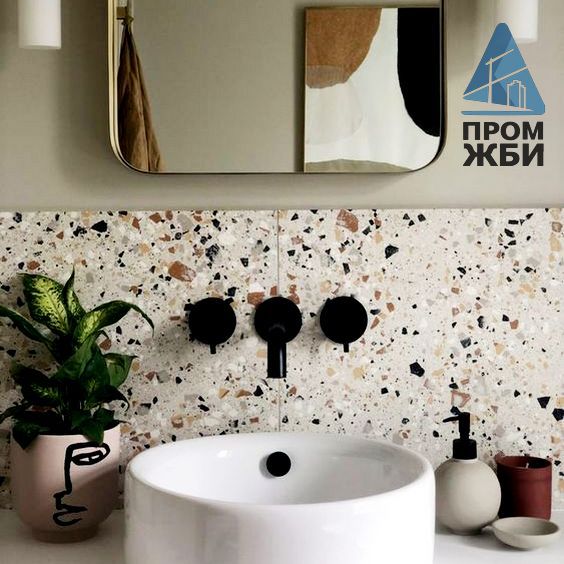 Терраццо – старинная технология. Изначально ее использовали для заливки пола, но впоследствии стали изготавливать детали интерьера и отделочные материалы в таком же узнаваемом неповторимом стиле. Сама технология заключается в замешивании специального состава на основе цемента (серого или белого) с добавкой присадок и особых наполнителей – кусочков мрамора, гранита и других скальных пород, крошки и отсева, остающихся после обработки камня. Из состава формируют изделия, а после застывания и высыхания их поверхность тщательно шлифуют. На выходе – изделия с гладкой поверхностью и мозаичным рисунком.